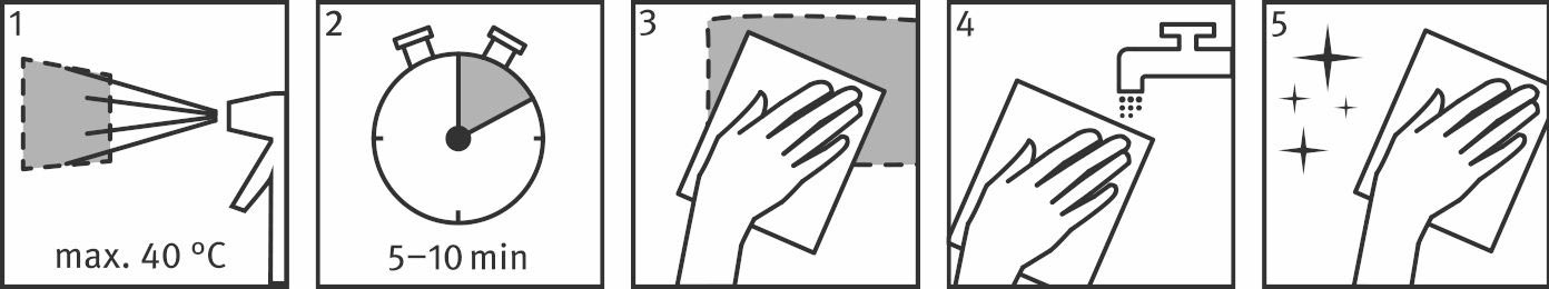 Використовуйте засіб при кімнатній температурі. Рівномірно розпиліть на поверхню та залиште діяти 5–10 хвилин. Для пригорілих залишків — не менше 2 годин або на ніч. Повністю видаліть розм’якшені забруднення губкою або м’якою серветкою, змийте водою та витріть насухо.