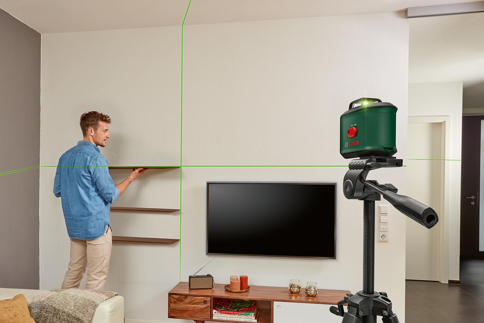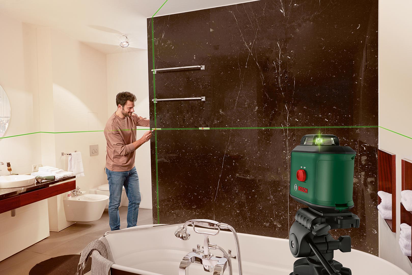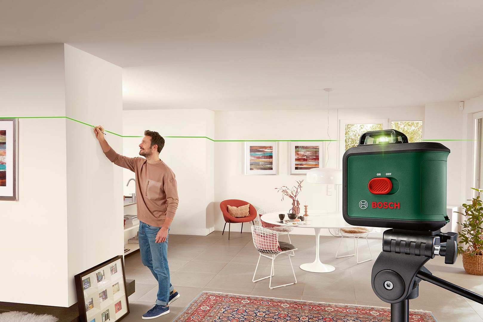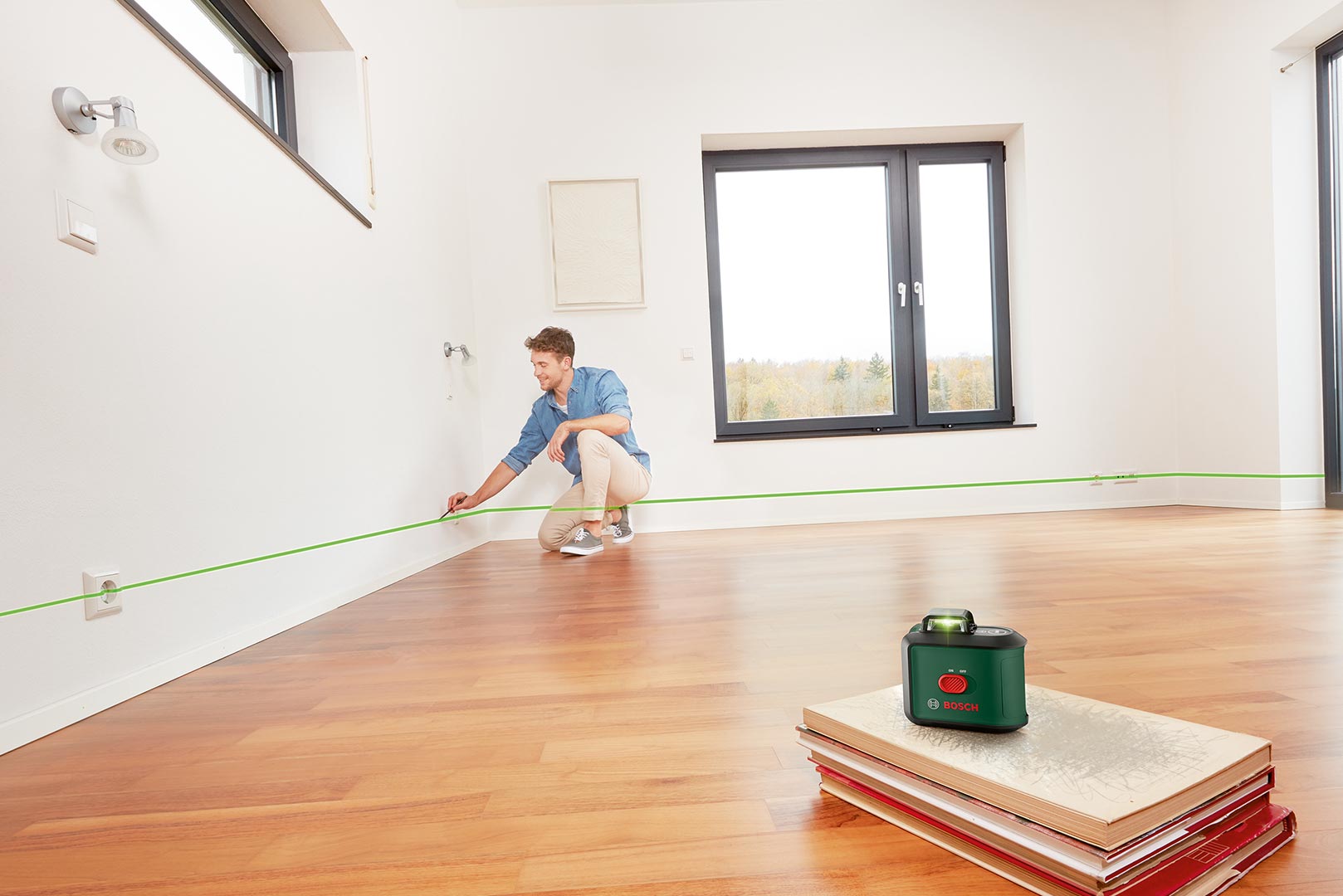 UniversalLevel 360 робить високоточне вирівнювання по всій кімнаті само собою зрозумілим. Проекція горизонтальної лазерної лінії на 360° забезпечує просте і зручне вирівнювання по декількох стінах, а технологія зеленого лазера забезпечує відмінну видимість лінії навіть при яскравому освітленні.
