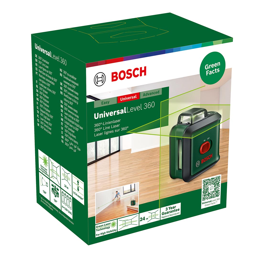 Забезпечуючи відмінну видимість для високоточного вирівнювання по всій кімнаті, UniversalLevel 360 - це те, що відбувається, коли точність, універсальність і зручність поєднуються в лінійному лазері. Самовирівнююча проекція лазерної лінії на 360° по горизонталі і 120° по вертикалі забезпечує зручне і швидке вирівнювання, а технологія зеленого лазера значно покращує видимість, забезпечуючи зручну роботу навіть при яскравому освітленні.