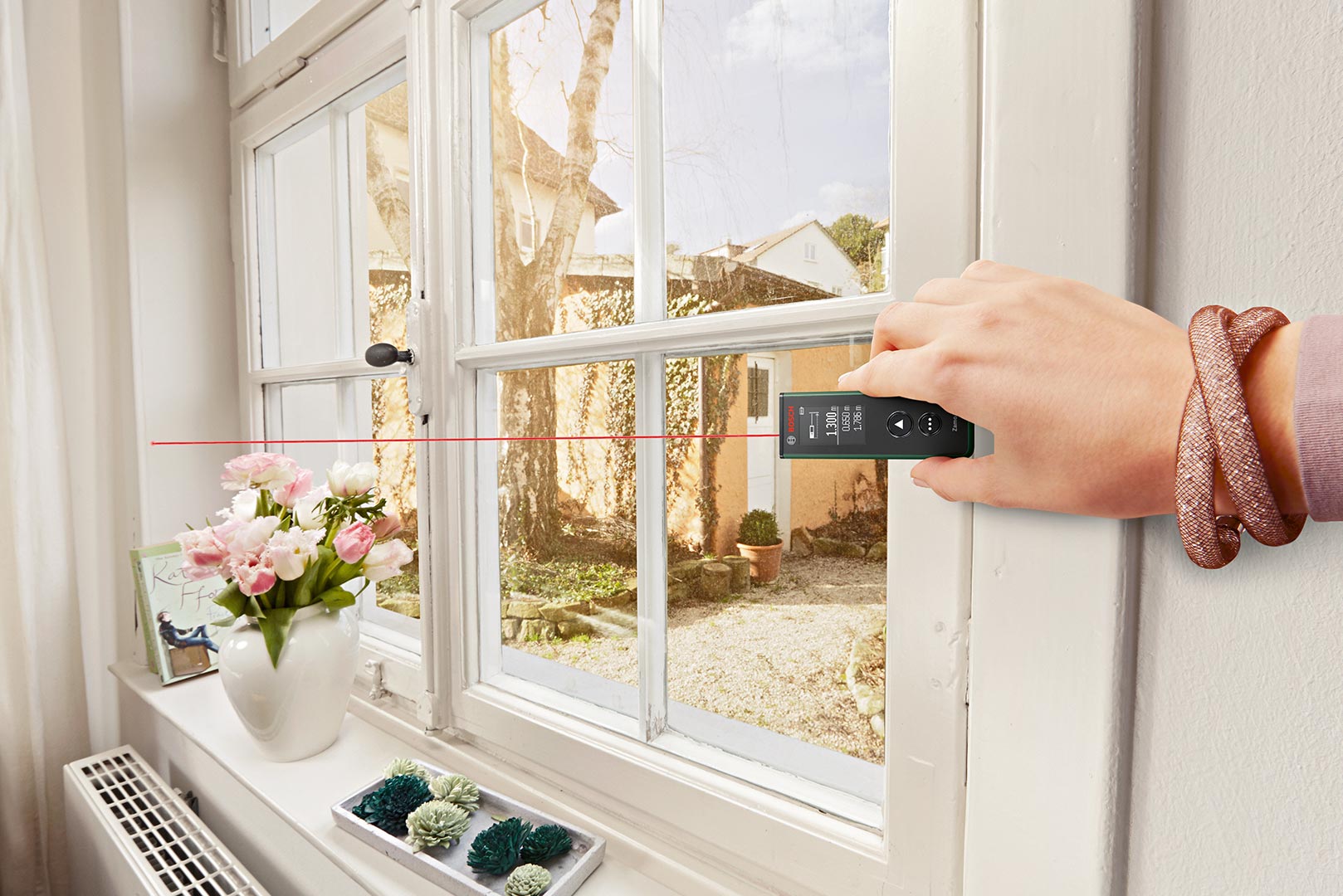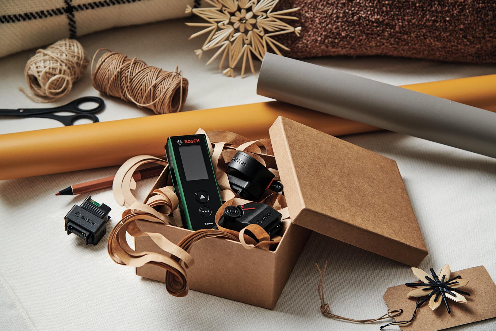 Для більшої зручності цей простий у використанні інструмент має додаткову вимірювальну функціональність завдяки трьом насадкам,які можна придбати окремо: Лінійка для вирівнювання картин або інших об'єктів, коліщатко для вимірювання кривих і нерівних поверхонь, а також 1,5-метрова стрічка для вимірювання окремо розташованих об'єктів і окружностей.