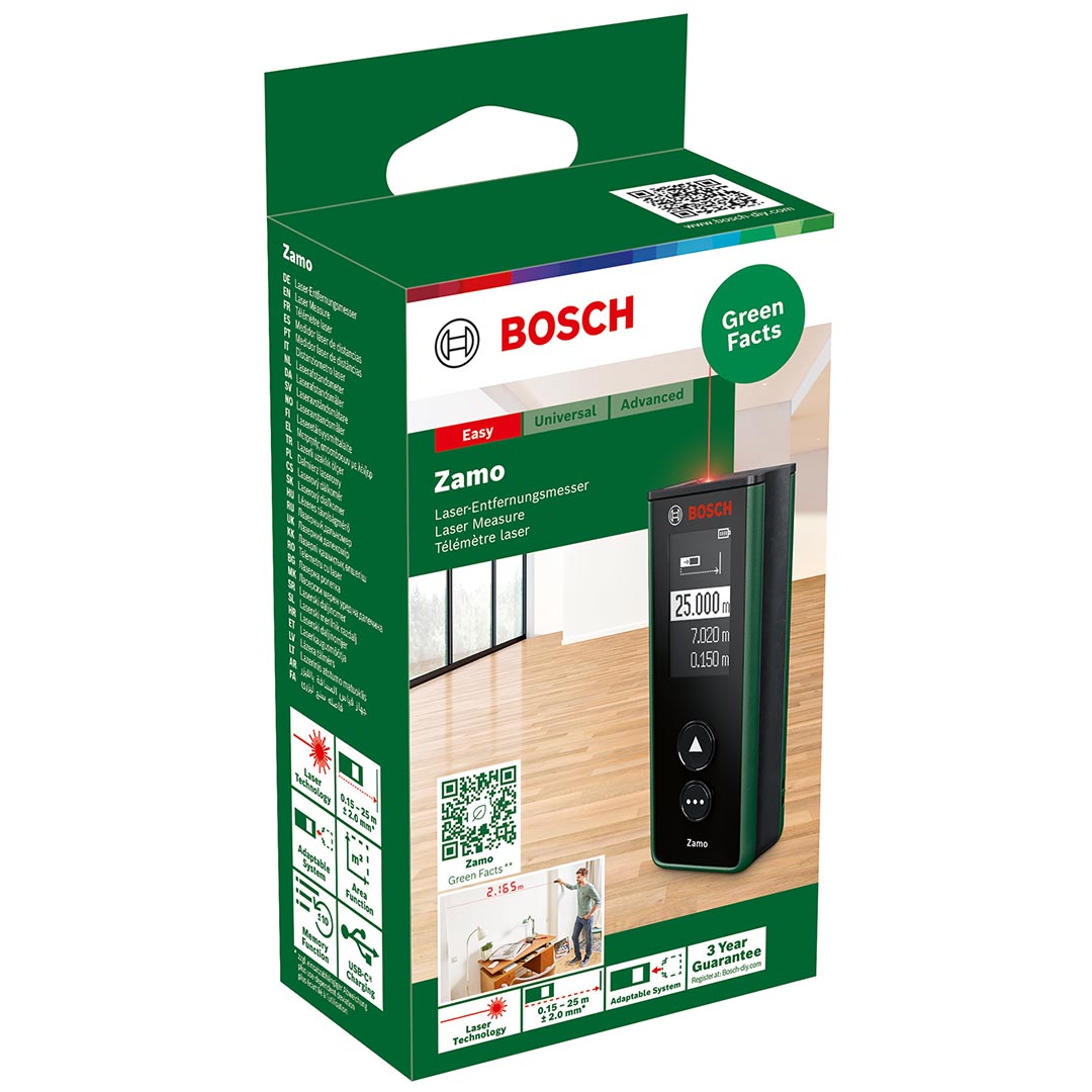 Вимірювання відстаней з лазерним далекоміром Zamo не потребує зусиль. Простий у використанні, Zamo ідеально підходить для вимірювання довжини та висоти приміщень до 25 метрів, а також для розрахунку площі підлоги та інших поверхонь, при визначенні потреби в підлоговому покритті або шпалерах. Три насадки, які можна придбати окремо, розширюють вимірювальні можливості Zamo.