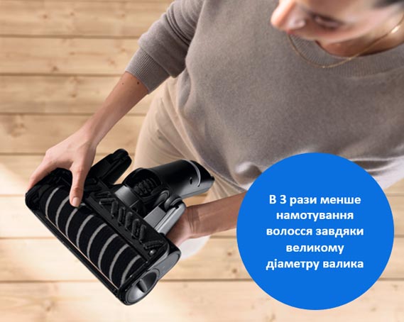 Електрична насадка MicroClean із LED підсвіткою має великий діаметр валика, що запобігає заплутування волосся та гарантує ретельне очищення всіх типів підлоги.