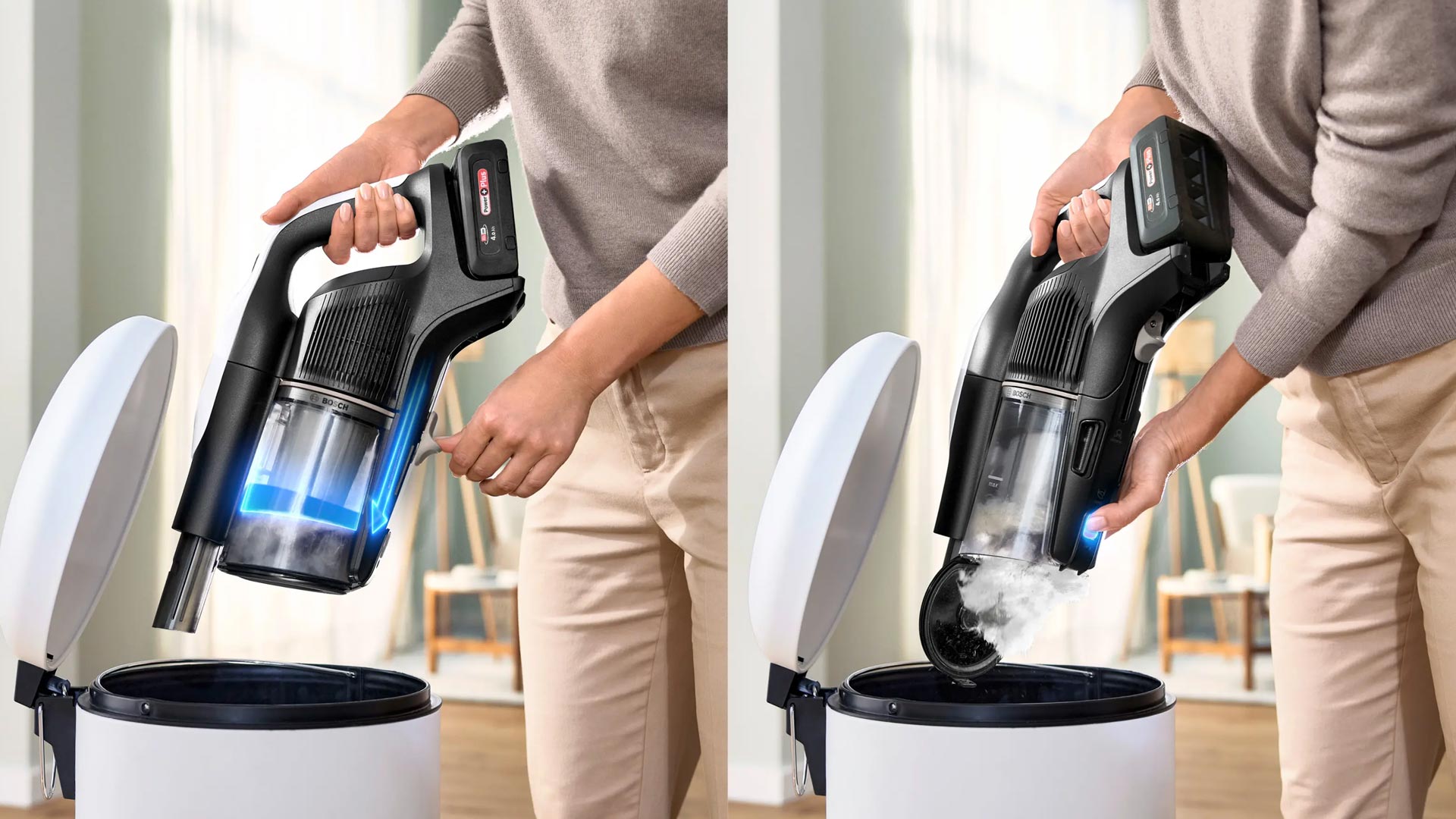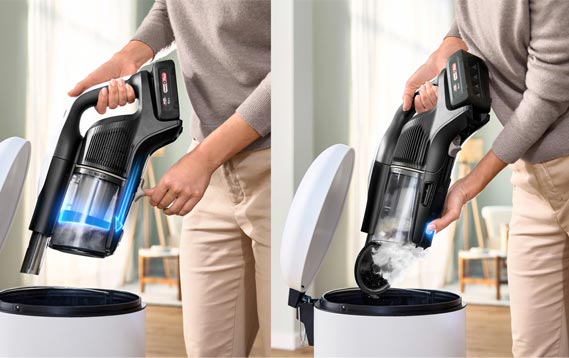• Легке спорожнення контейнра для пилу за допомогою слайдера для стискання пилу: гігієнічне спорожнення пилозбірника шляхом відкриття кришки та виштовхування бруду за допомогою слайдера. Менш часте спорожнення пилозбірника завдяки стисненню пилу.