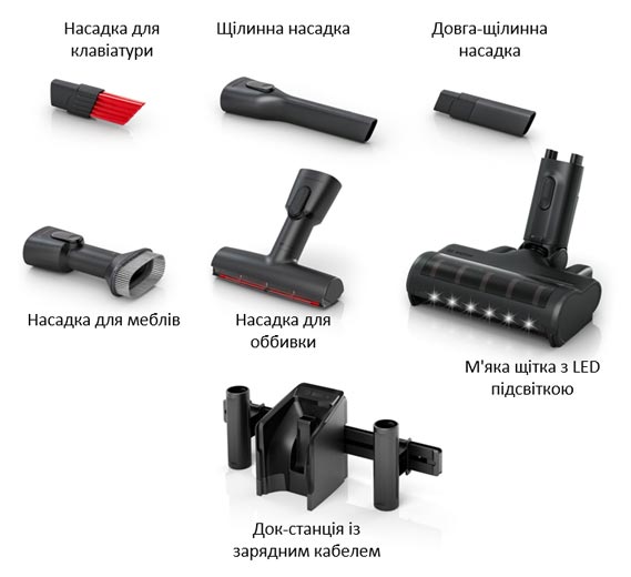 Аксесуари в комплектіМ'яка щітка із LED світлом • XXL Насадка для оббивки з кліпсою • Насадка для меблів • Насадка для клавіатури та ящика • Насадка для щілин • Довга гнучка щілинна насадка • 1 х змінний акумулятор • Зарядний кабель • Док-станція • Рейка для док-станції • 2 x Перехідник на рейку