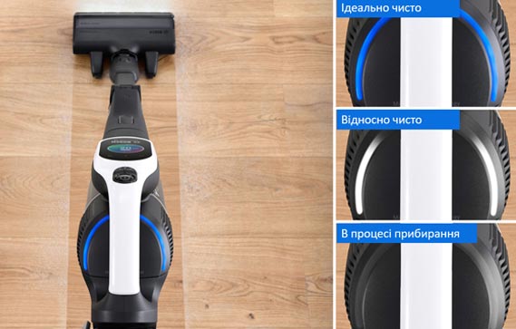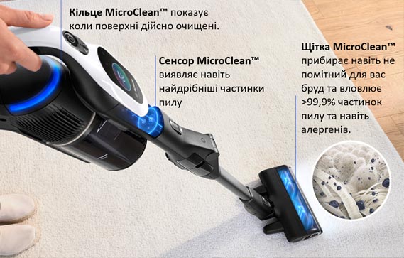 • Технологія MicroClean: датчик MicroClean виявляє навіть найдрібніші частинки пилу, а кільце MicroClean показує коли поверхні дійсно очищені.