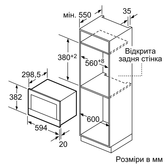 • Розміри ніші (ВxШxГ): 362 мм - 382 мм x 560 мм - 568 мм x 300 мм