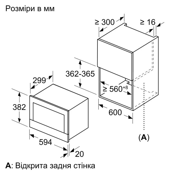 • Розміри ніші (ВxШxГ) : 362 мм - 382 мм x 560 мм - 568 мм x 300 мм