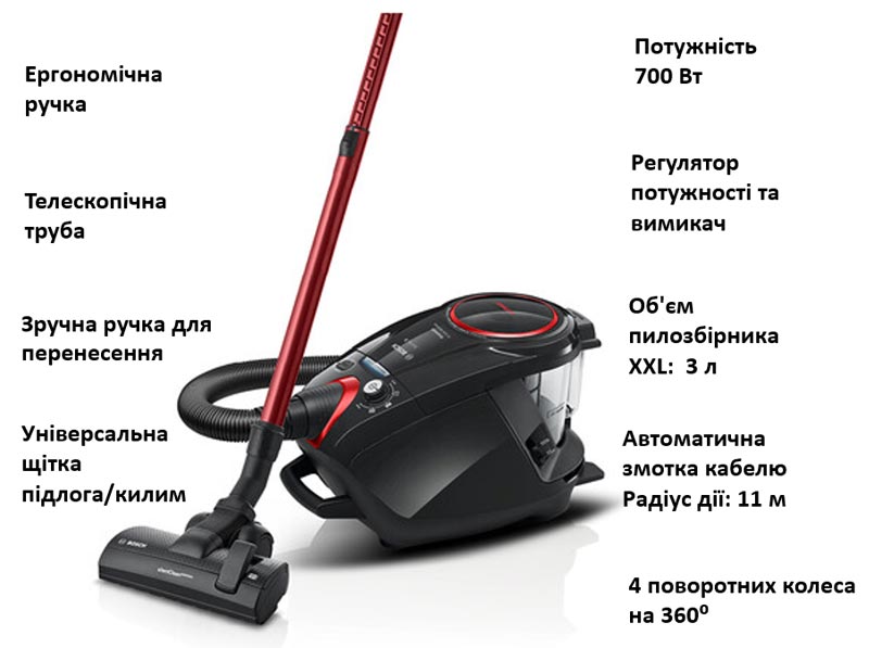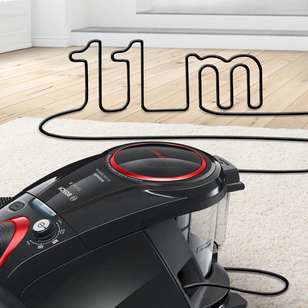 Завдяки цьому пилососу Bosch прибирання стане ще легшим, ніж раніше. Конструкція приладу і довгий 11-метровий кабель дозволяють працювати в радіусі 11 метрів. Тепер ви можете пилососити навіть у великому будинку, не перемикаючи кабель в іншу розетку.