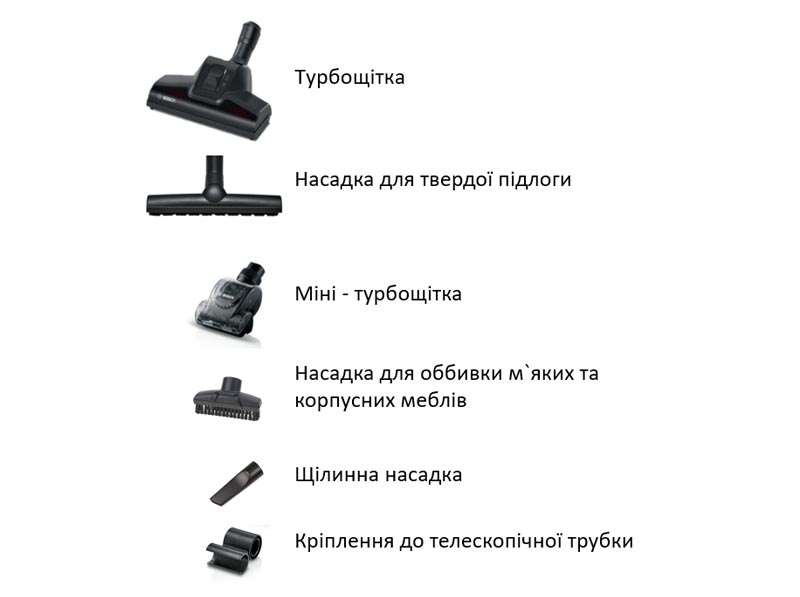 Аксесуари в комплектіУніверсальна щітка підлога/килим • Турбощітка • Насадка для твердої підлоги • Міні-щітка • Насадка 2 в 1 для оббивки та меблів • Насадка для щілин