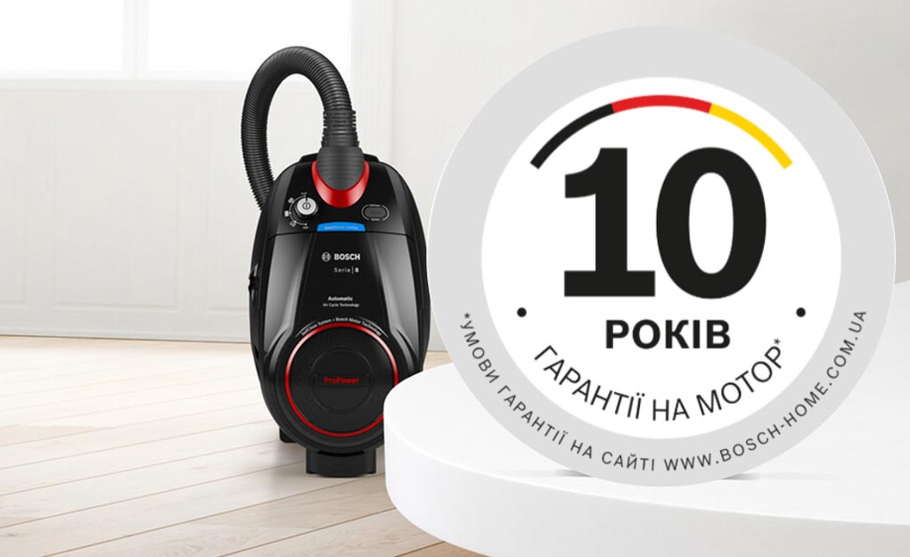 • 10-річна гарантія на мотор *: незмінно висока ефективність технології виробництва моторів Bosch. Вироблено в Німеччині. (*Умови гарантії на https://www.bosch-home.com/motor-warranty/)