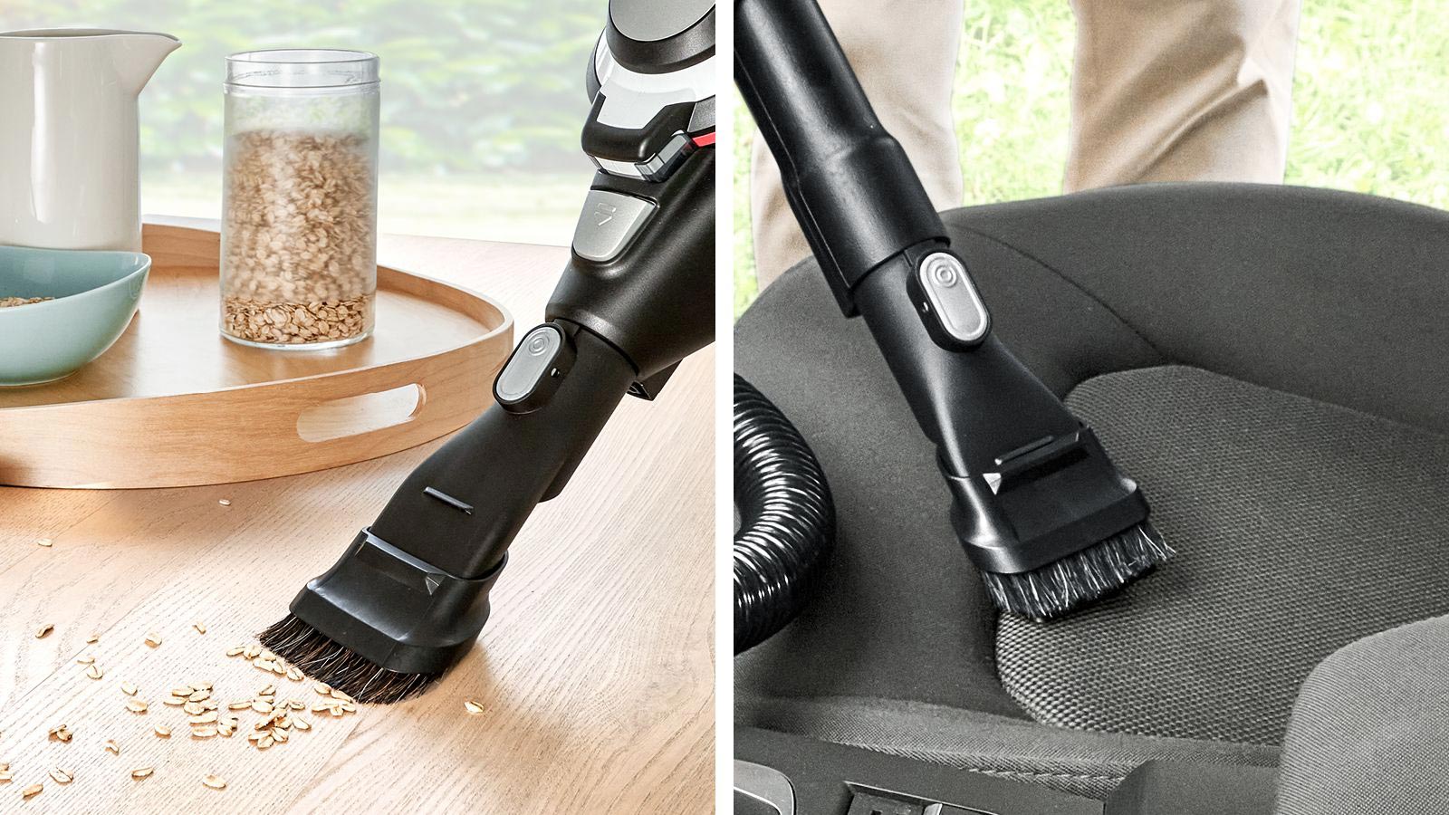 • 2 функції в одному аксесуарі: використовуйте м’яку щетину для делікатних поверхонь та меблів, або насадку для оббивки для стійкого бруду та пилу.