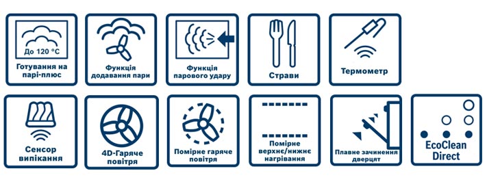 Режими приготування4D-гаряче повітря • помірне гаряче повітря • піца • нижнє нагрівання • гриль, велика площа • гриль, мала площа • гриль з конвекцією • верхнє/нижнє нагрівання • верхнє/нижнє нагрівання помірне • підтримання страв у гарячому стані • томління/слабке нагрівання • попереднє підігрівання посуду • Air Fry