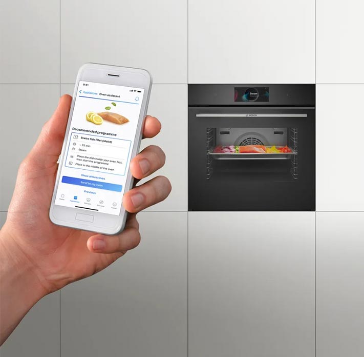 Технологія Home Connect дає змогу під’єднати духову шафу до мережі Wi-Fi та керувати нею з мобільного застосунку: налаштовувати параметри приладу, перевіряти його стан, зберігати улюблені програми, запускати їх будь-звідки та у зручний час, отримувати сповіщення про завершення програм.