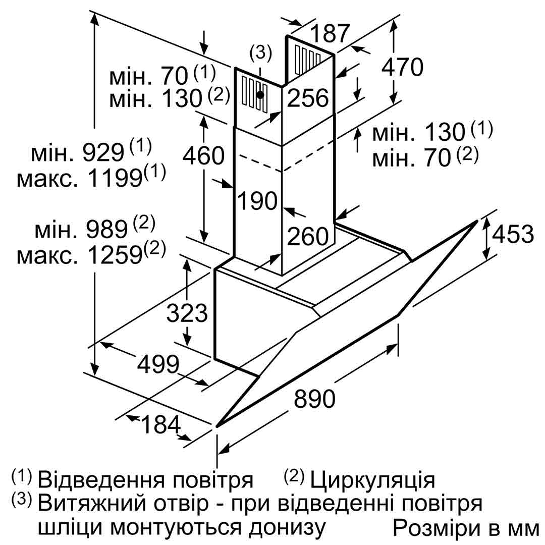 Розміри приладу у разі експлуатації в режимі циркулювання повітря, з повітряним каналом (ВxШxГ): 989-1259 x 890 x 499 мм
