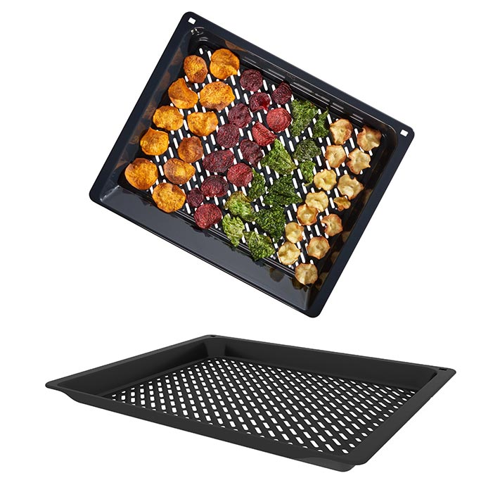 Завдяки отворам у деку гаряче повітря в духовці оптимально огортає продукт і забезпечує хрустку скоринку без додавання великої кількості олії. Це деко можна використовувати для готування з використанням грилю та зручно мити в посудомийній машині.