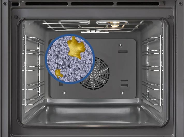 Задня, верхня та бічні стінки камери духової шафи вкриті надтонкими керамічними сферами, які розщеплюють бризки жиру під час готування їжі. Це значно полегшує миття духової шафи. Для найкращого результату ми радимо час від часу вмикати цикл відновлення цього покриття.
