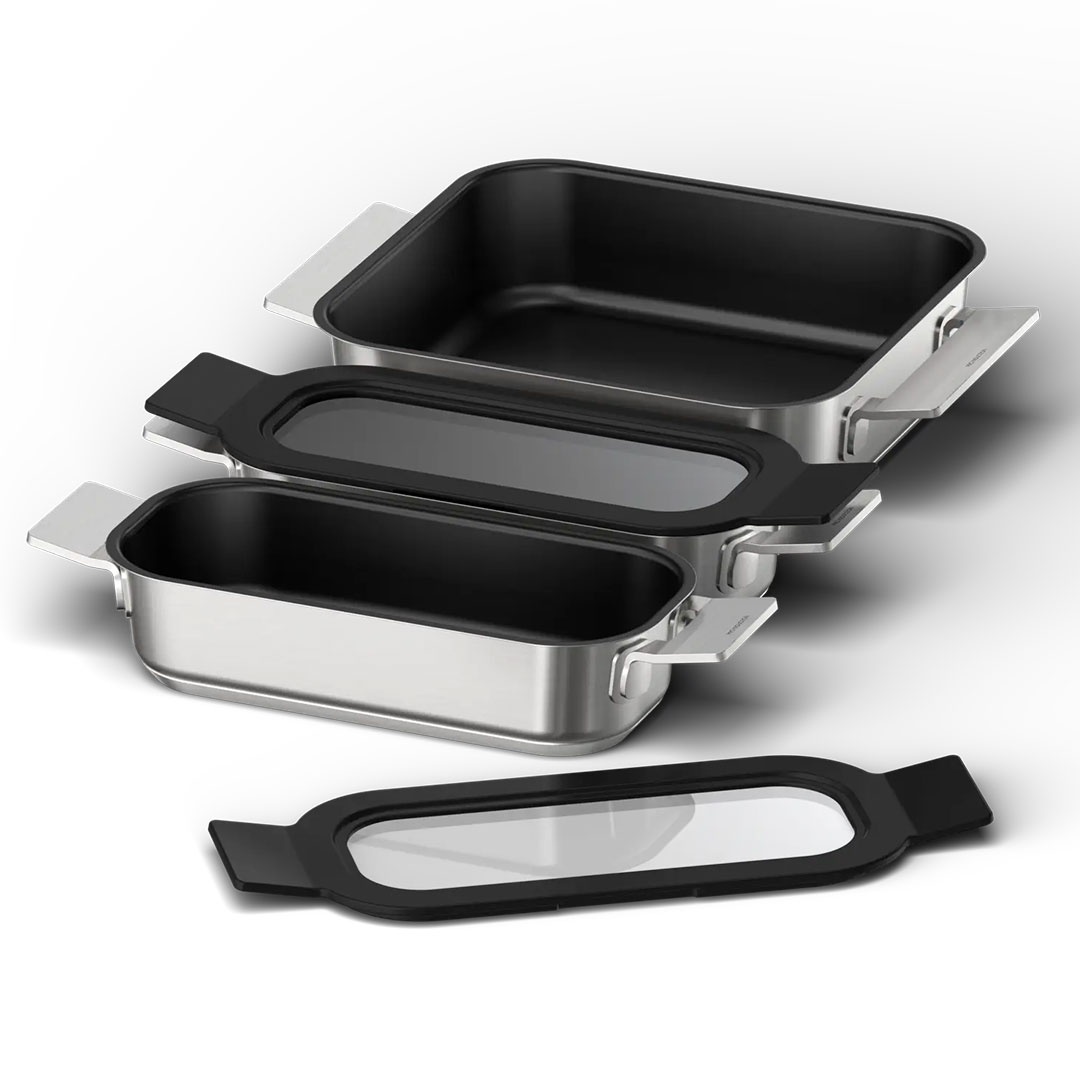 • 2 малі сковорідки Flex Pan зі скляними кришками: 30 × 11 см (верхня частина з урахуванням ручок) / 20 × 7,5 см (дно)
