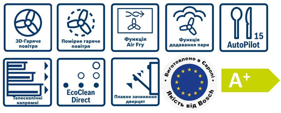 Духові шафи Bosch досягають класу енергоефективності A+* завдяки оптимізованій циркуляції повітря, високоякісним матеріалам, з яких виготовлено прилад, і поліпшеним ізоляційним властивостям – все це забезпечує значне зниження енергоспоживання.
