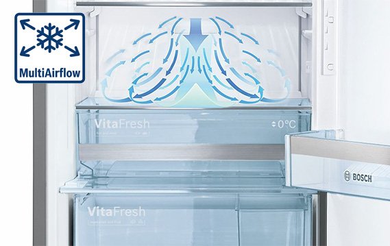 Розміщення продуктів всередині холодильника може виявитись непростим завданням: в деяких відділеннях вони залишаються свіжими, в інших – висихають. Система вентилювання Мультиейрфлоу прискорює циркуляцію повітря по всьому пристрою та підтримує рівні температури та вологості зверху вниз. Таким чином, коливання температур мінімізуються, а час охолодження зменшується. Це допомагає Вашим продуктам залишатися свіжими і зберігати свій смак.
