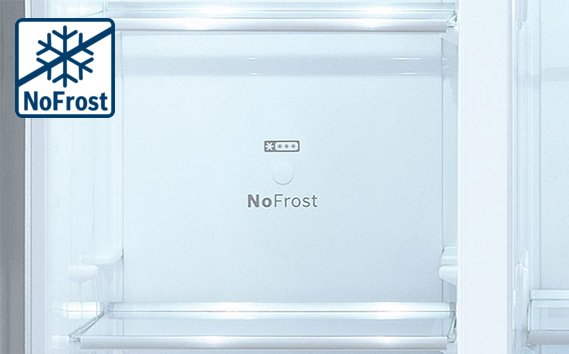 Розморожування морозильника вручну може бути дуже надокучливим та трудомістким процесом. Завдяки нашим новим холодильникам з системою NoFrost, Ви легко позбавитесь цієї проблеми! На відміну від традиційних холодильників, вологість повітря у холодильнику з системою NoFrost постійно збирається в центральній холодильній установці, яка регулярно розморожується автоматично. Утворений конденсат просто відводиться назовні з холодильника, де він потім випаровується. Таким чином, система NoFrost постійно позбавляє Ваш холодильник від льоду, а Вас від необхідності розморожувати його вручну.