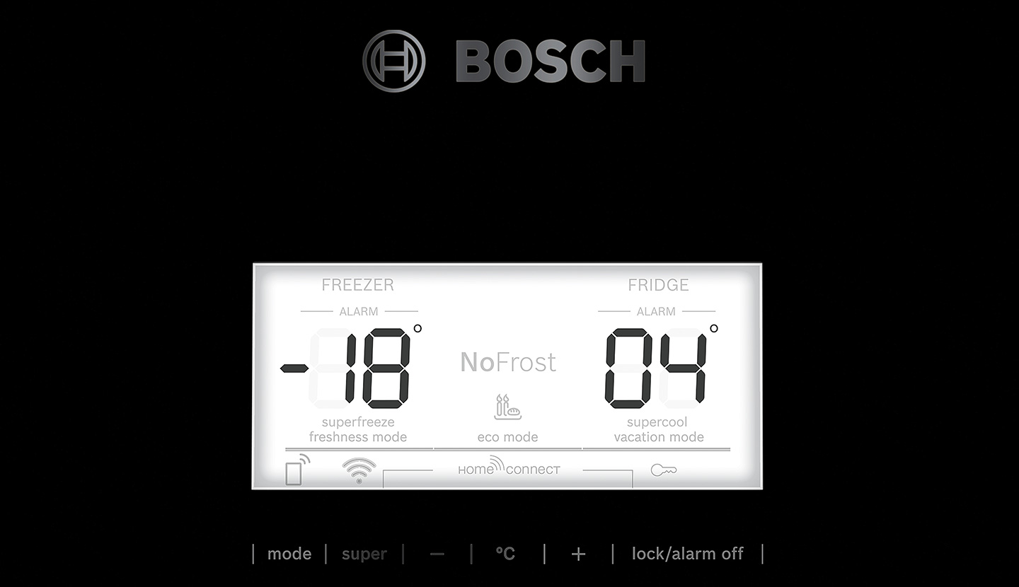 • Рідкокристалічний дисплей на зовнішній стороні дверцят для вибору температури в обох камерах, спеціальних режимів роботи приладу та функцій