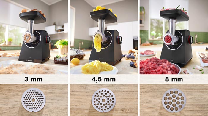 • Диски для подрібнення різних розмірів; перфоровані диски з нержавіючої сталі (3 мм, 4,5 мм і 8 мм) забезпечують легке подрібнення сирого або вареного м'яса, риби та сиру. Також можна обробити картоплю на вареники або приготувати деруни та подрібнити підсушені булочки в панірувальні сухарі для використання в інших стравах. Можна мити в посудомийній машині.