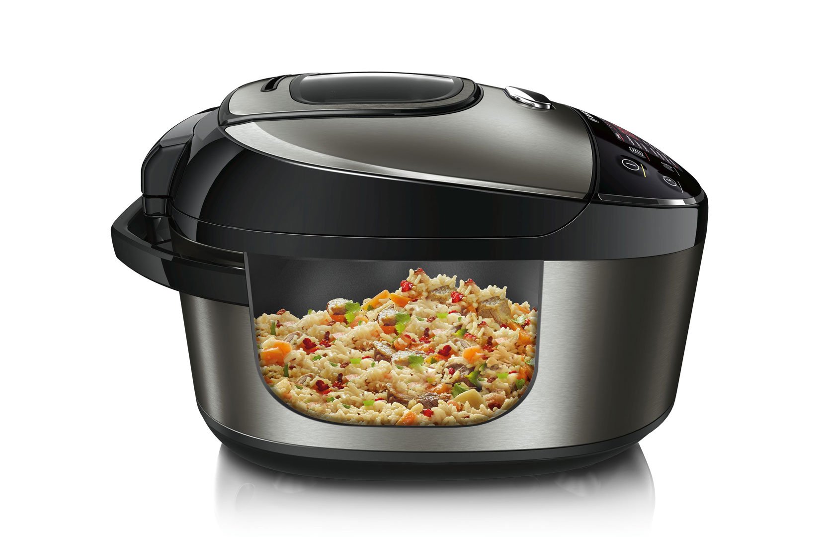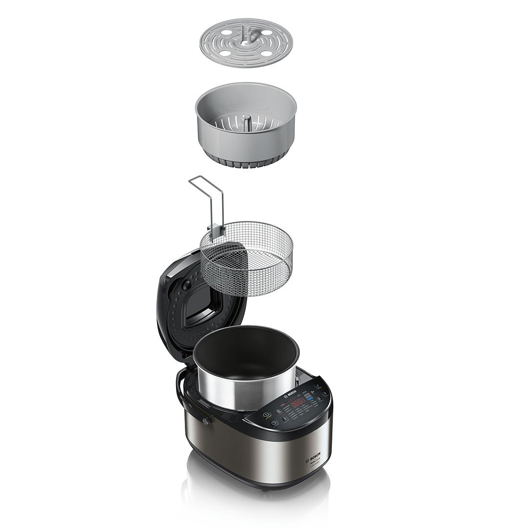 • Програми (коротке/середнє/тривале приготування): підігрівання, борщ, готування на парі, тушкування, смаження, смаження на фритюрі, випікання, варіння, паста, крупи/рис, молочна каша, боби, плов, холодець, варення, йогурт