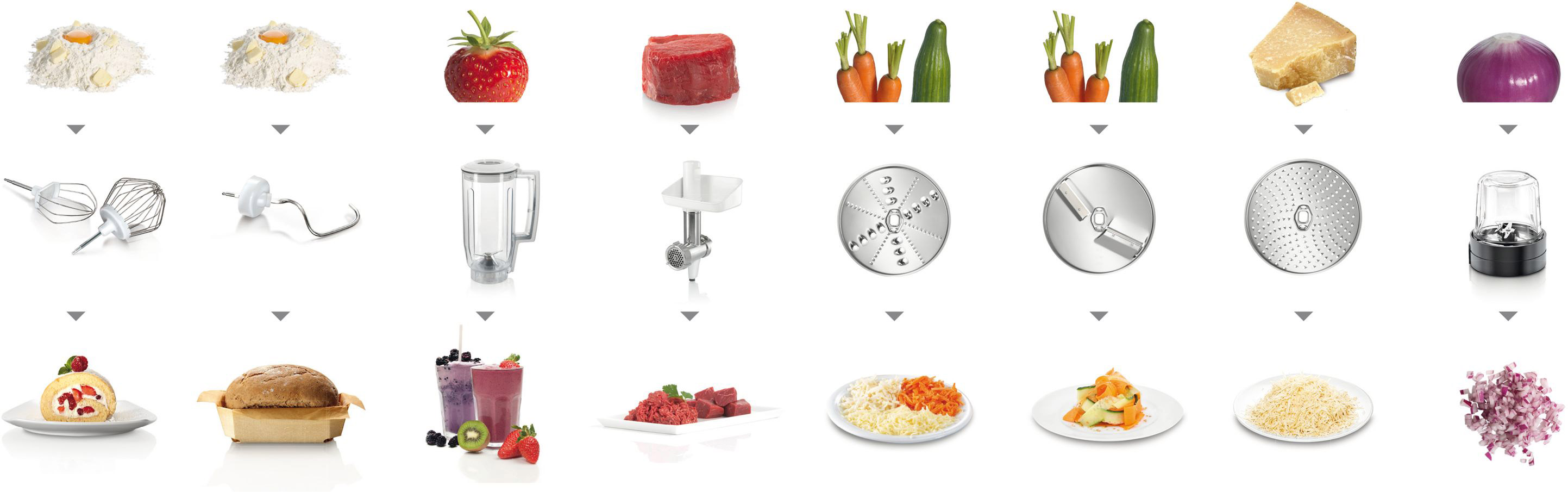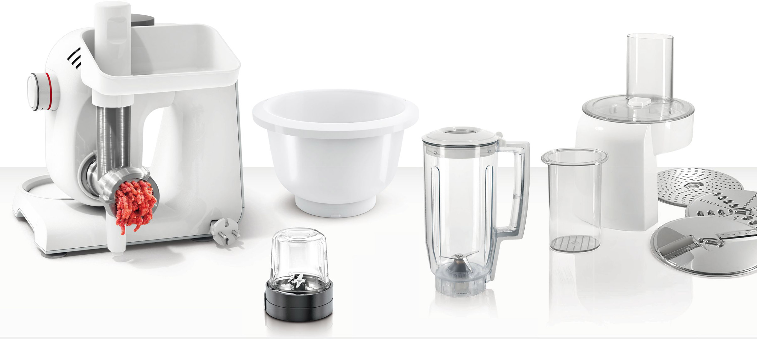 НасадкиБлендер • Вінчик для збивання • Вінчик для рідкого тесту • Кришка від розбризкування • Гак для тіста • М'ясорубка • Терка/шинкування • Чопер • Пластикова чаша