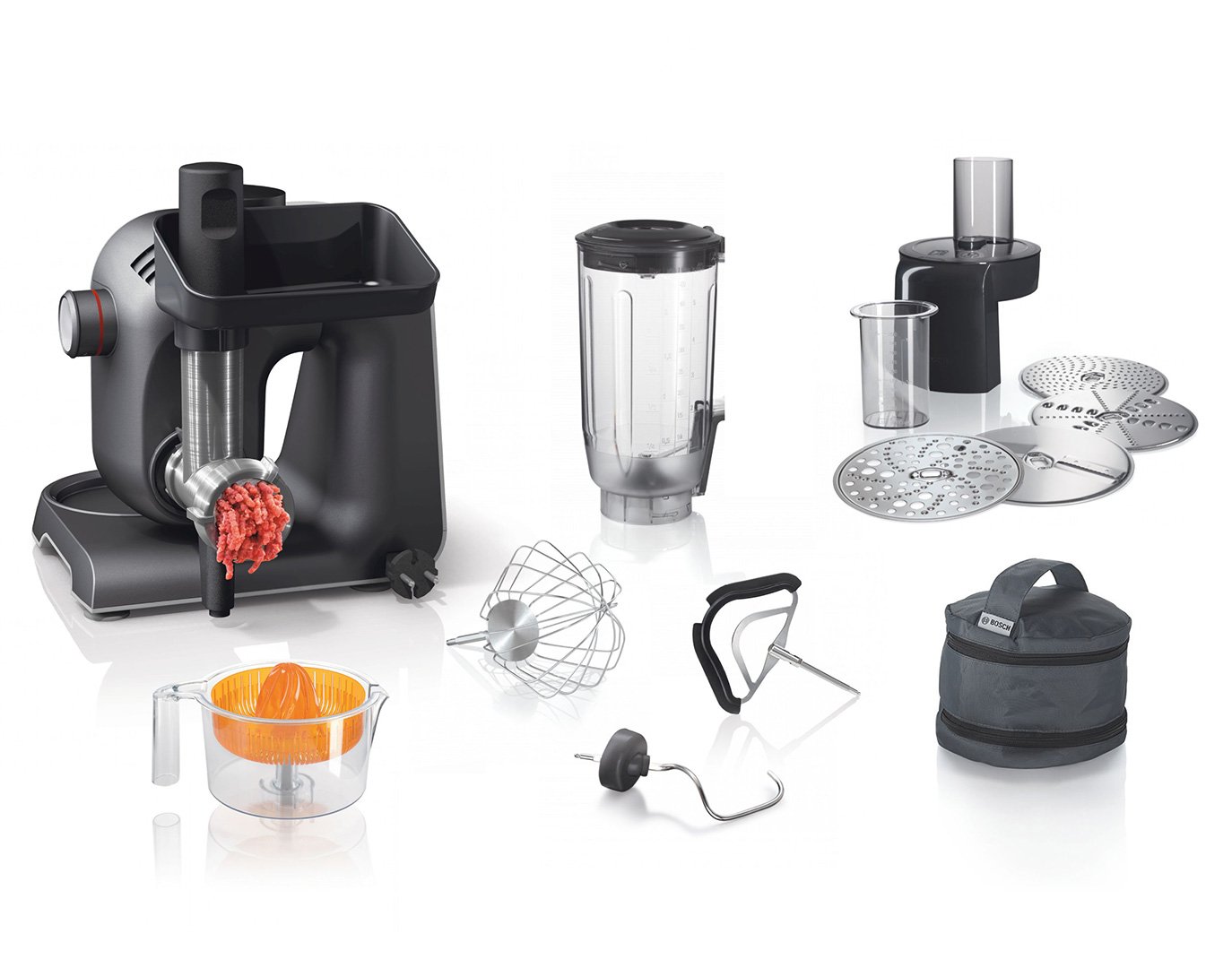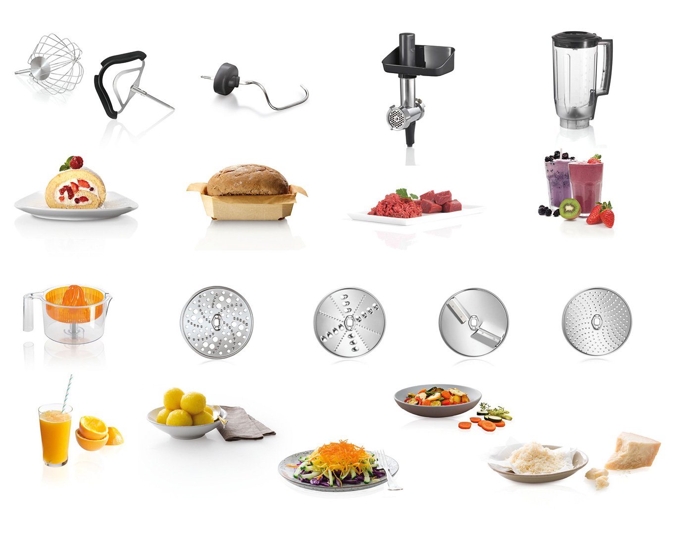НасадкиБлендер • Вінчик для збивання • Вінчик для рідкого тесту • Кришка від розбризкування • Гак для тіста • М'ясорубка • Терка/шинкування • Цитрус-пресс