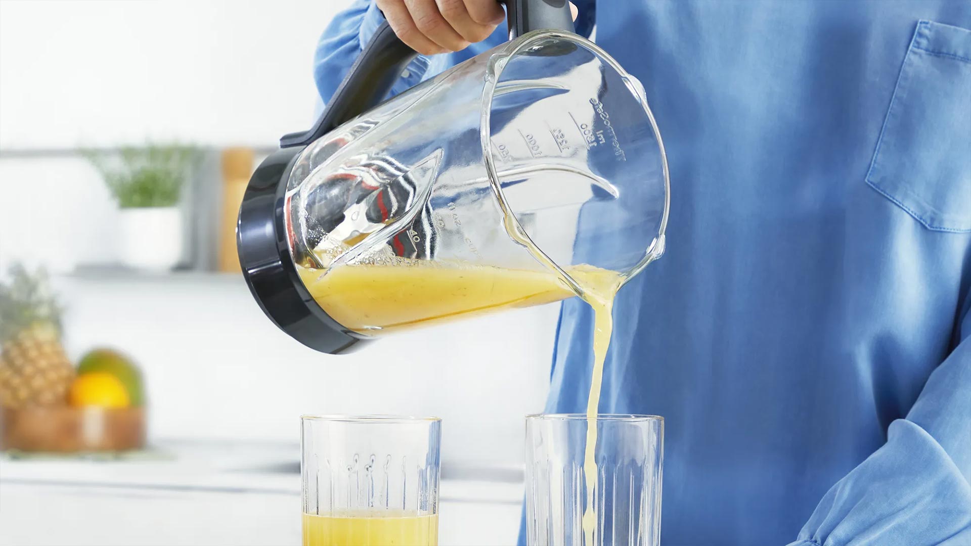 • Блендер із технологічного скла ThermoSafe об'ємом 2.3 л (з їжею 1.5 л) забезпечує безпечне перемішування гарячого супу чи холодних напоїв
