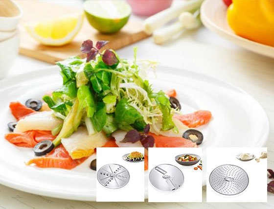 У комплекті 3 диски для нарізання, натирання та шаткування овочів.