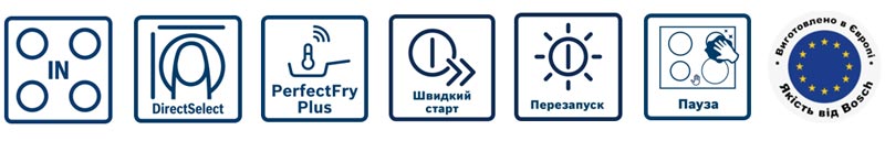 Функції варильної поверхніЗахист від дітей • Звуковий сигнал • Індикатор залишкового тепла • Об'єднані зони • Розпізнавання посуду • Нагрівання з прискоренням (буст) • Швидкий старт • Функція перезапуску