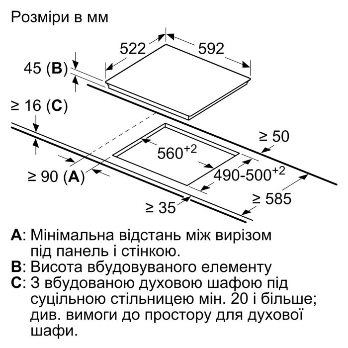 • Розміри ніші для вбудовування: (ВхШхГ) 39 мм x 560 мм x 490 мм