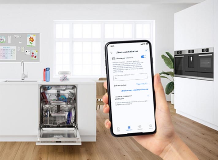 Після придбання таблеток достатньо вказати їх кількість у застосунку, і Home Connect автоматично відстежуватиме їх запас після кожного циклу. Коли залишиться менше визначеної кількості таблеток, ви отримаєте відповідне сповіщення.
