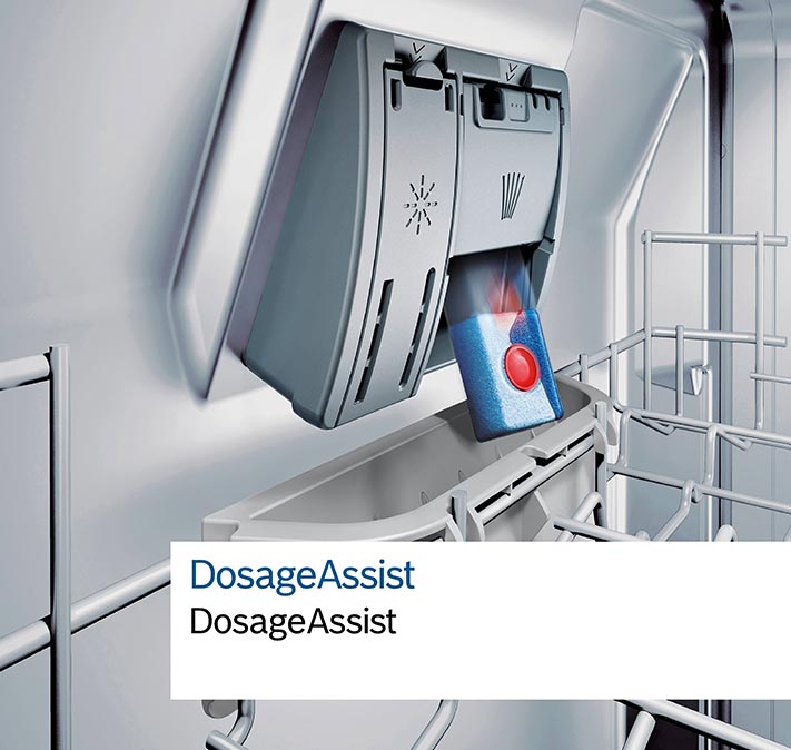 Перед початком циклу мийний засіб із диспенсера на дверцятах потрапляє до спеціальної кювети у верхньому коробі, де він рівномірно розчиняється.