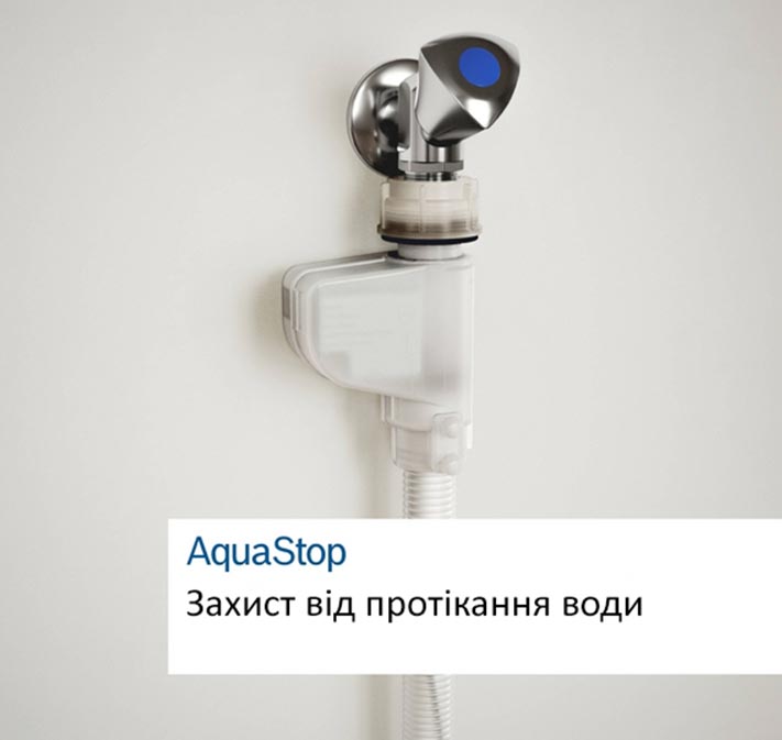 Система AquaStop складається з подвійного заливного шланга, запобіжного клапана і піддона, розташованого в нижній частині приладу, з поплавковим вимикачем. Якщо сенсор виявляє протікання, посудомийна машина автоматично зупиняє роботу, відкачує воду і перекриває спеціальний клапан поряд із краном.