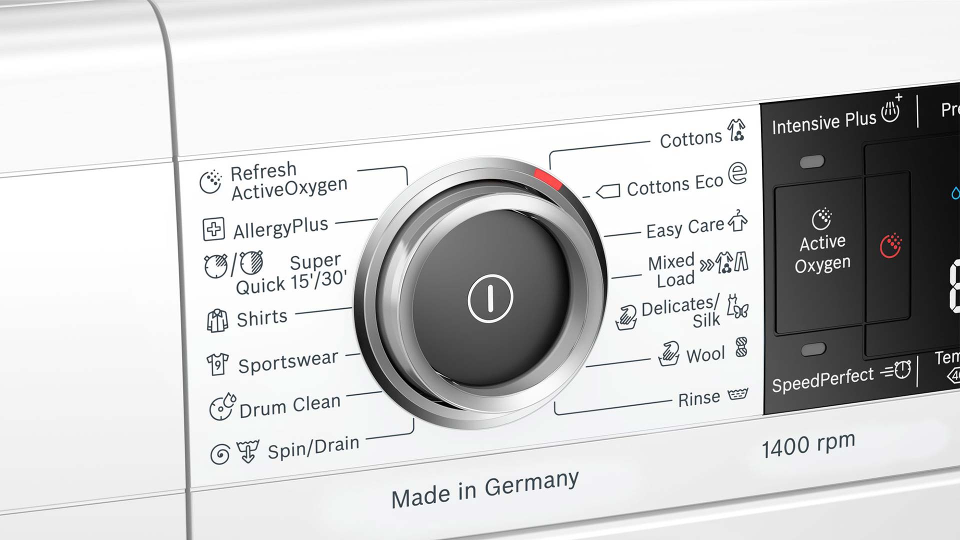 Сенсорні кнопки TouchControl: Легке прасування, Ввімк./Вимк., Прання закінчено, HygienicSteam-Antibacteria, Intensive Plus, Додаткове ополіскування, Старт/Пауза з можливістю дозавантаження, Вибір температури прання, varioSpeed / SpeedPerfect, Попереднє прання, Вибір кількості обертів віджимання/утримання води після останнього ополіскування