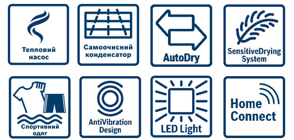 Особливості сушильної машиниБережне сушіння завдяки сенсору AutoDry • Smart Dry (СмартДрай) • Функція відтермінування • Зворотний рух барабана • Самоочисний конденсатор SelfCleaning Condenser • Можливість встановлення на пральну машину
