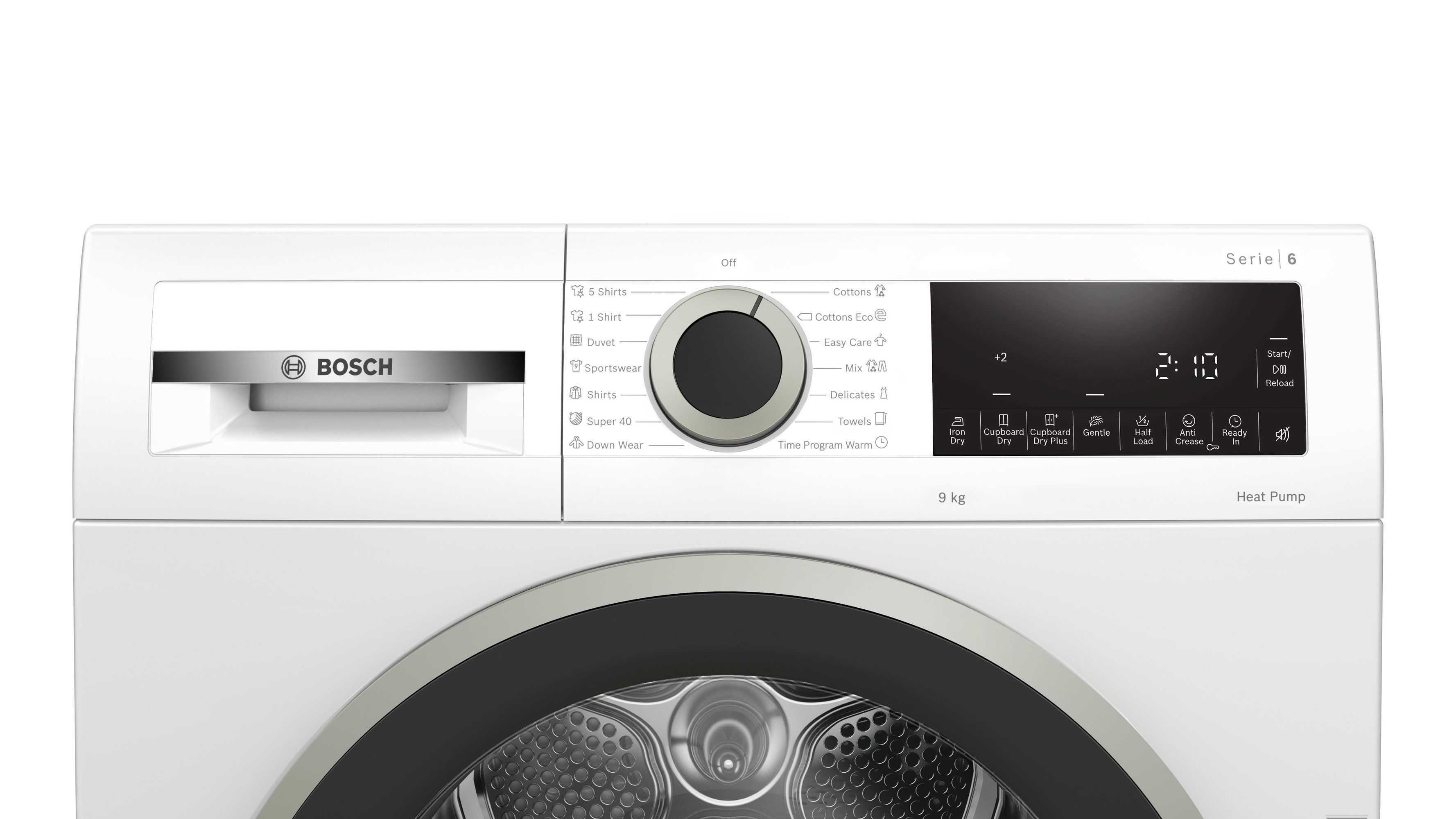 Великий світлодіодний дисплей для індикації ходу програми, обраних додаткових опцій, залишкового часу сушіння та програмування кінцевого часу сушіння на 1-24 год