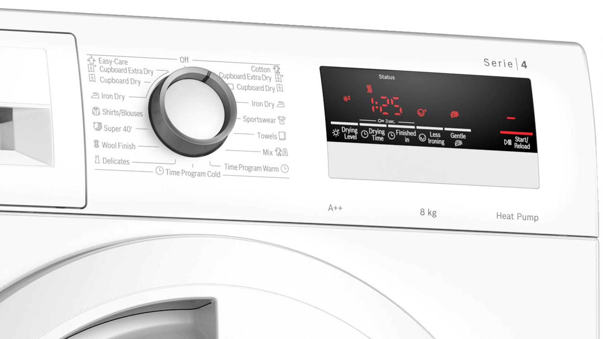 Сенсорні кнопки TouchControl: Ступінь сушіння (Drying level); Час сушіння (Drying Time), Закінчити у (Finished in); Легке прасування (Less Ironing); Делікатне сушіння (Gentle); Старт/Пауза (Start/Reload)
