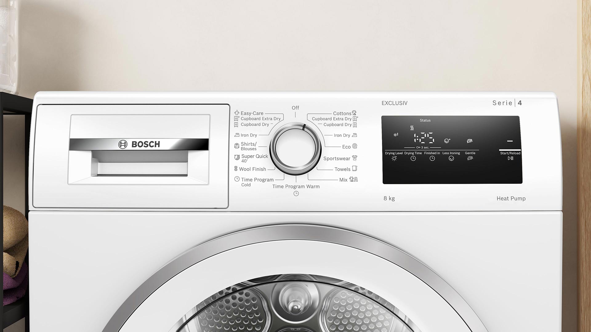 Програми: Бавовна • Синтетика • Змішані тканини • Спортивний одяг • Сорочки/блузи • Сушіння за часом: тепле повітря • Сушіння за часом: холодне повітря • Вовна/розпушування вовни • Супер 40 хв. • Рушники