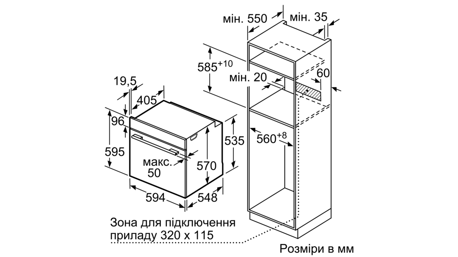 - Розміри ніші (ВxШxГ) : 585 мм - 595 мм x 560 мм - 568 мм x 550 мм