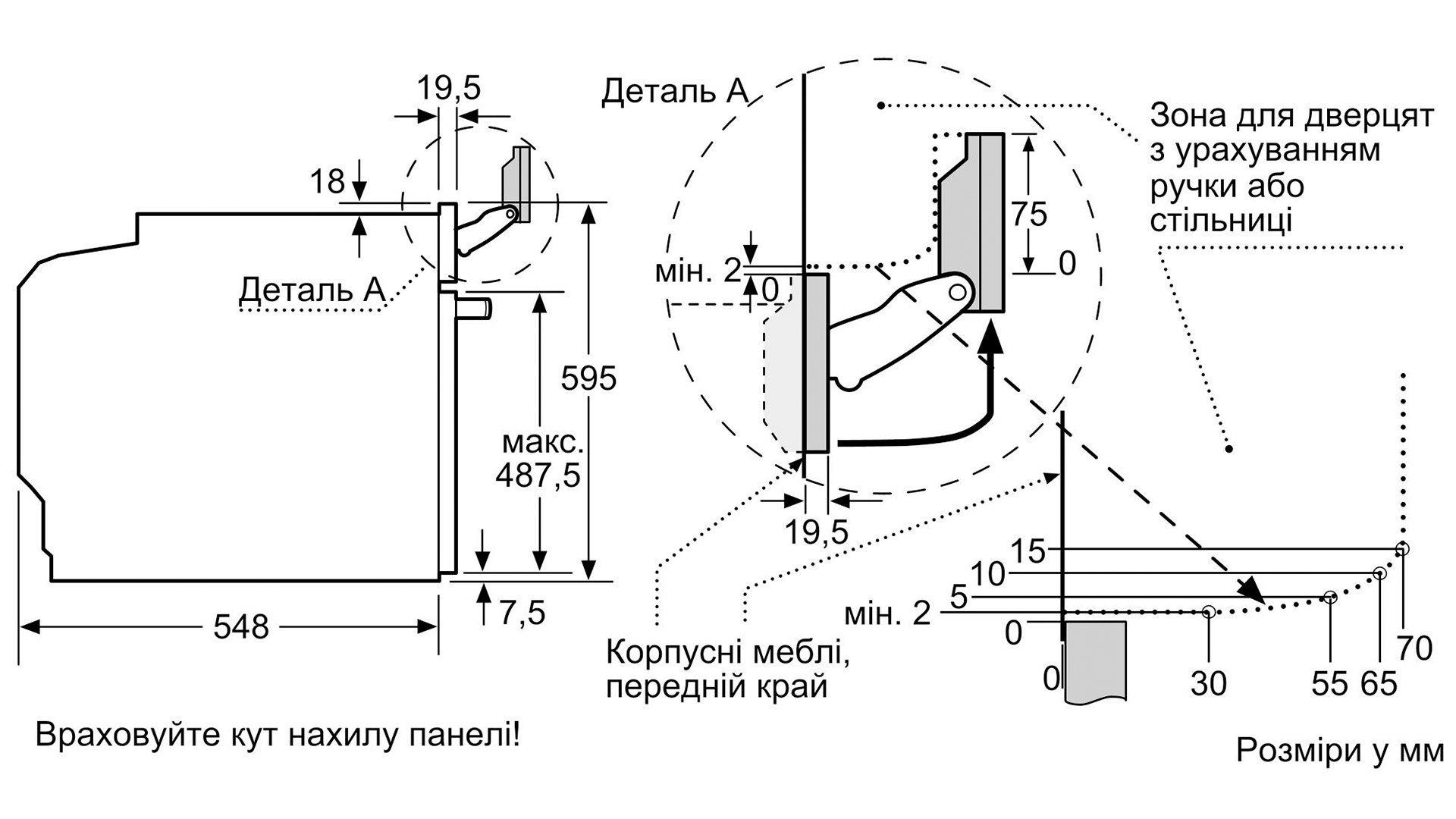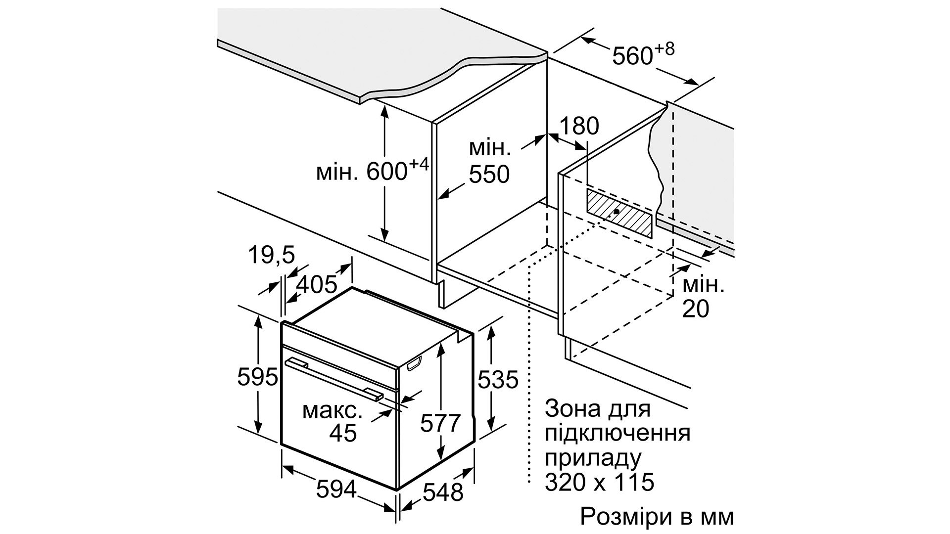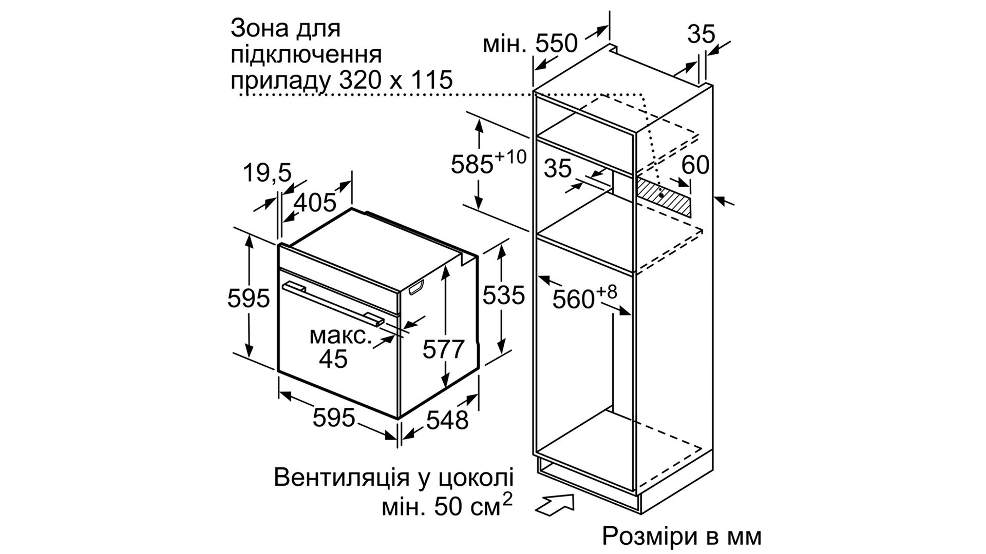Розміри ніші (ВxШxГ): 585 мм - 595 мм x 560 мм - 568 мм x 550 мм