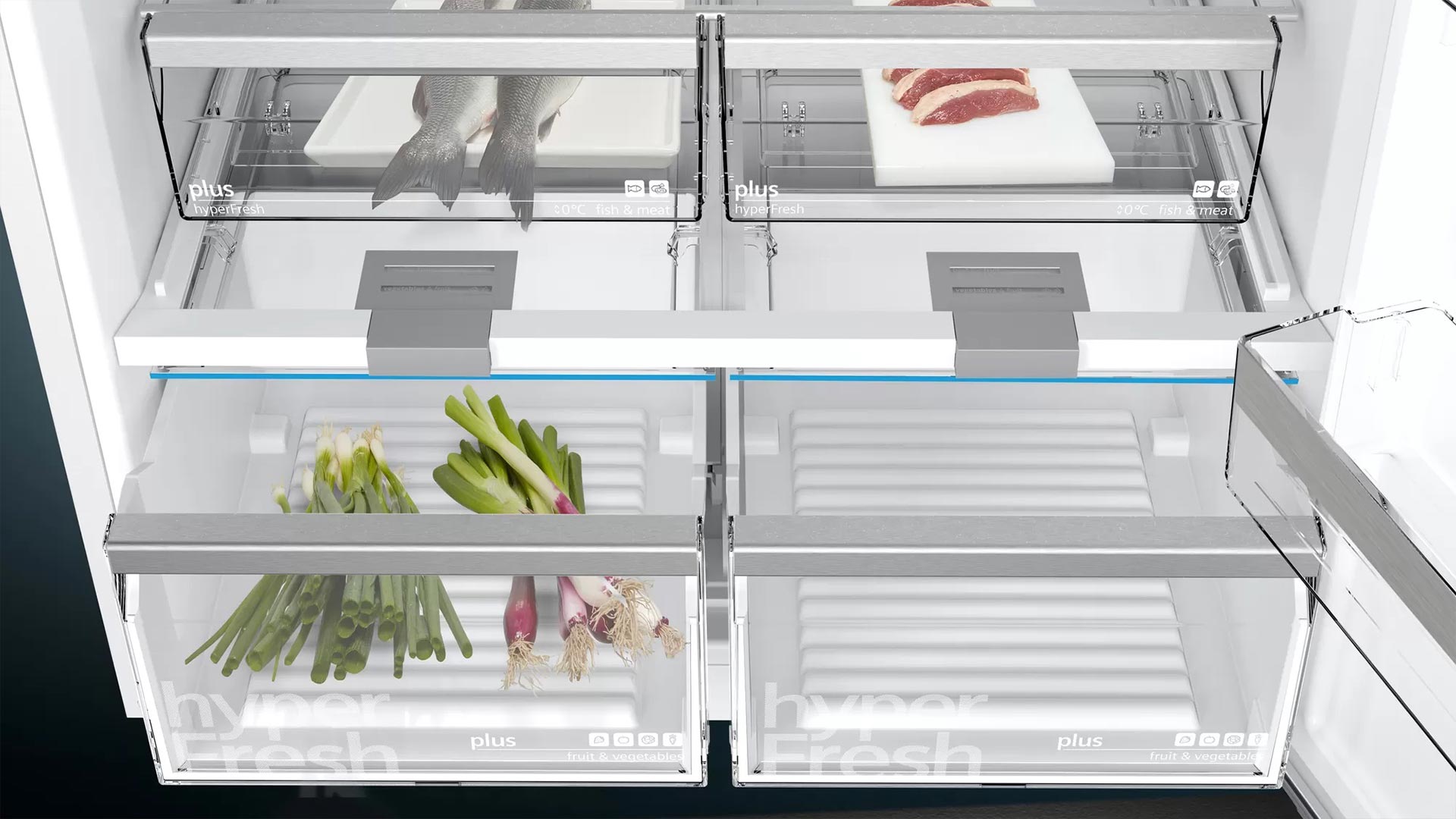 • 2 висувних ящика HyperFresh <> 0 ° C з регульованою температурою - довше зберігають м'ясо і рибу свіжими