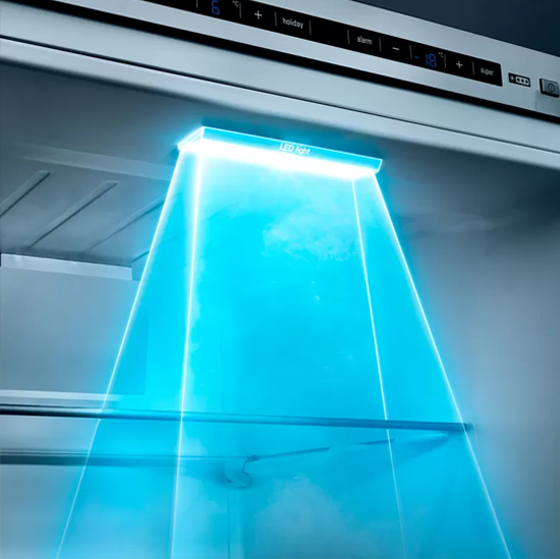 Увесь фокус на продуктах: Преміальне LED освітлення зверху та збоку холодильної камери підсвічує кожен куточок вашого холодильника.