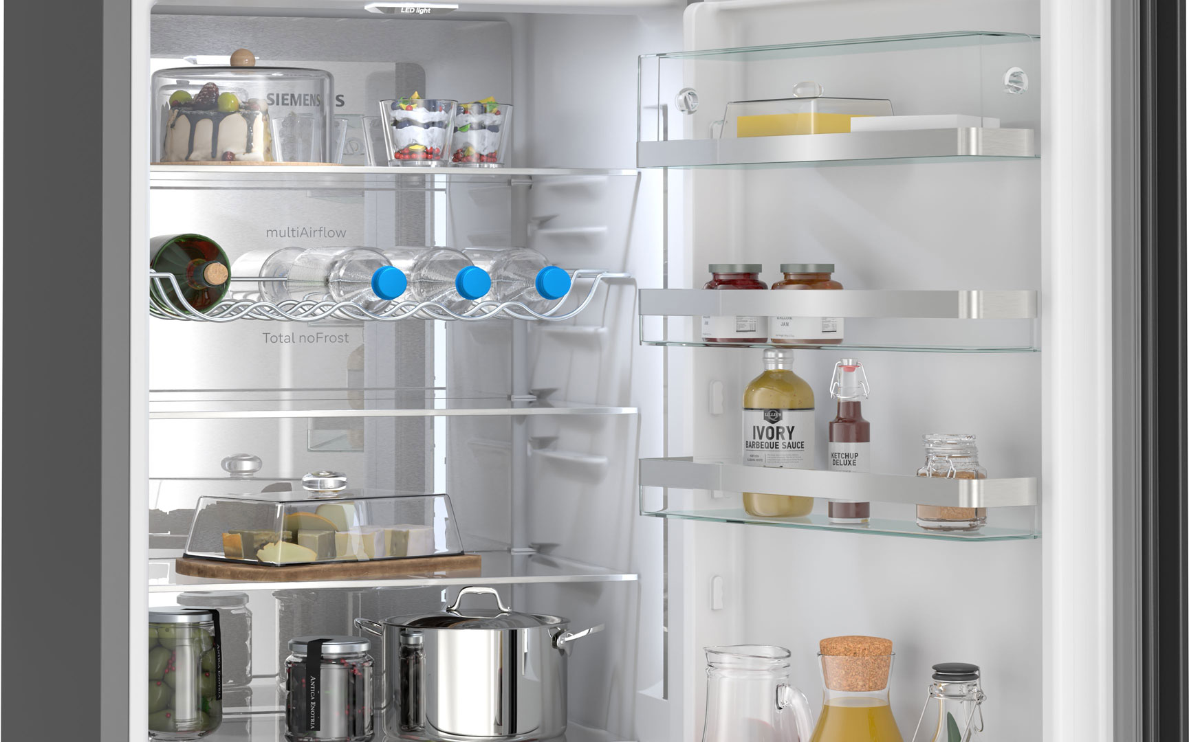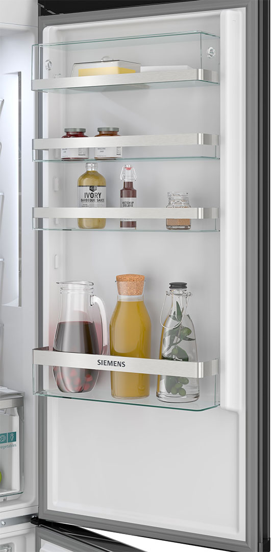 Особливості холодильникаРешітка для пляшок • Сенсорна панель керування • Зона свіжості • Перевішування дверей • Швидке замороження • LED-освітлення • Багатопотоковий рух повітря • Керування через Wi-Fi • Нульова камера