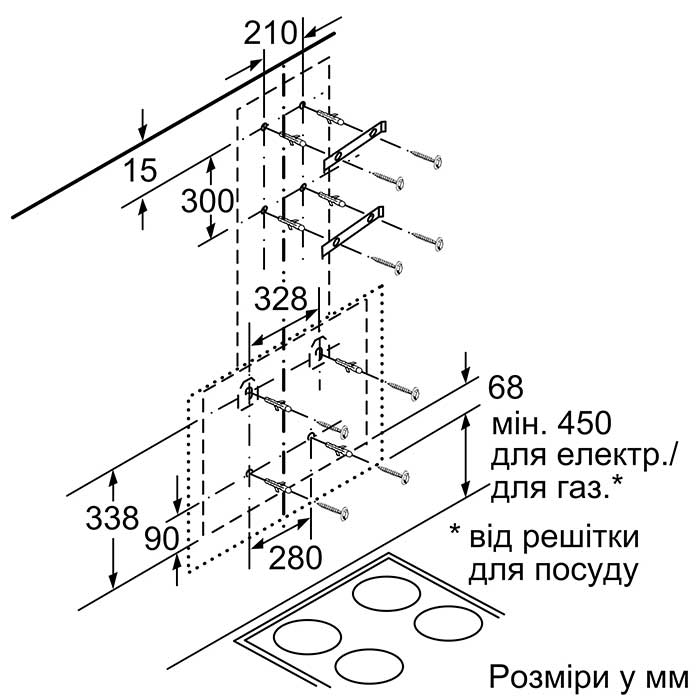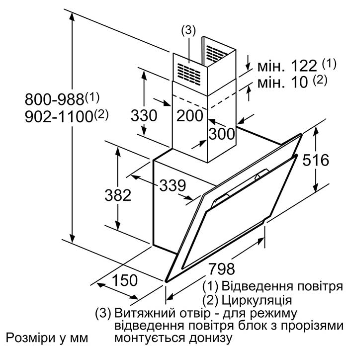 Розміри приладу, монтаж для роботи у режимі відведення повітря (ВxШxГ): 800-988 x 798 x 339 мм