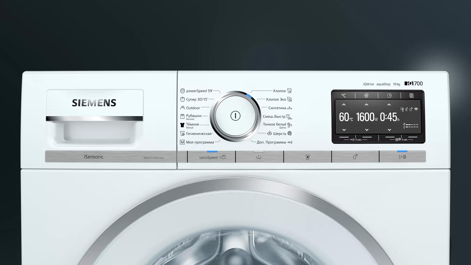 Сенсорні кнопки touchControl: Ввімк./Вимк., Прання закінчено, Remote Start, Старт/Пауза з можливістю дозавантаження, Навігація в меню, Вибір виду плям, Додаткові опції, Вибір температури прання, varioSpeed / SpeedPerfect, Попереднє прання, Вибір кількості обертів віджимання/утримання води після останнього ополіскування