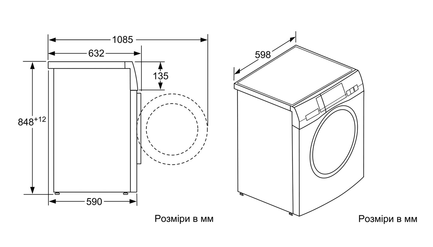• Діаметр отвору завантажувального люка: 32 см, кут відчинення дверцят:180°