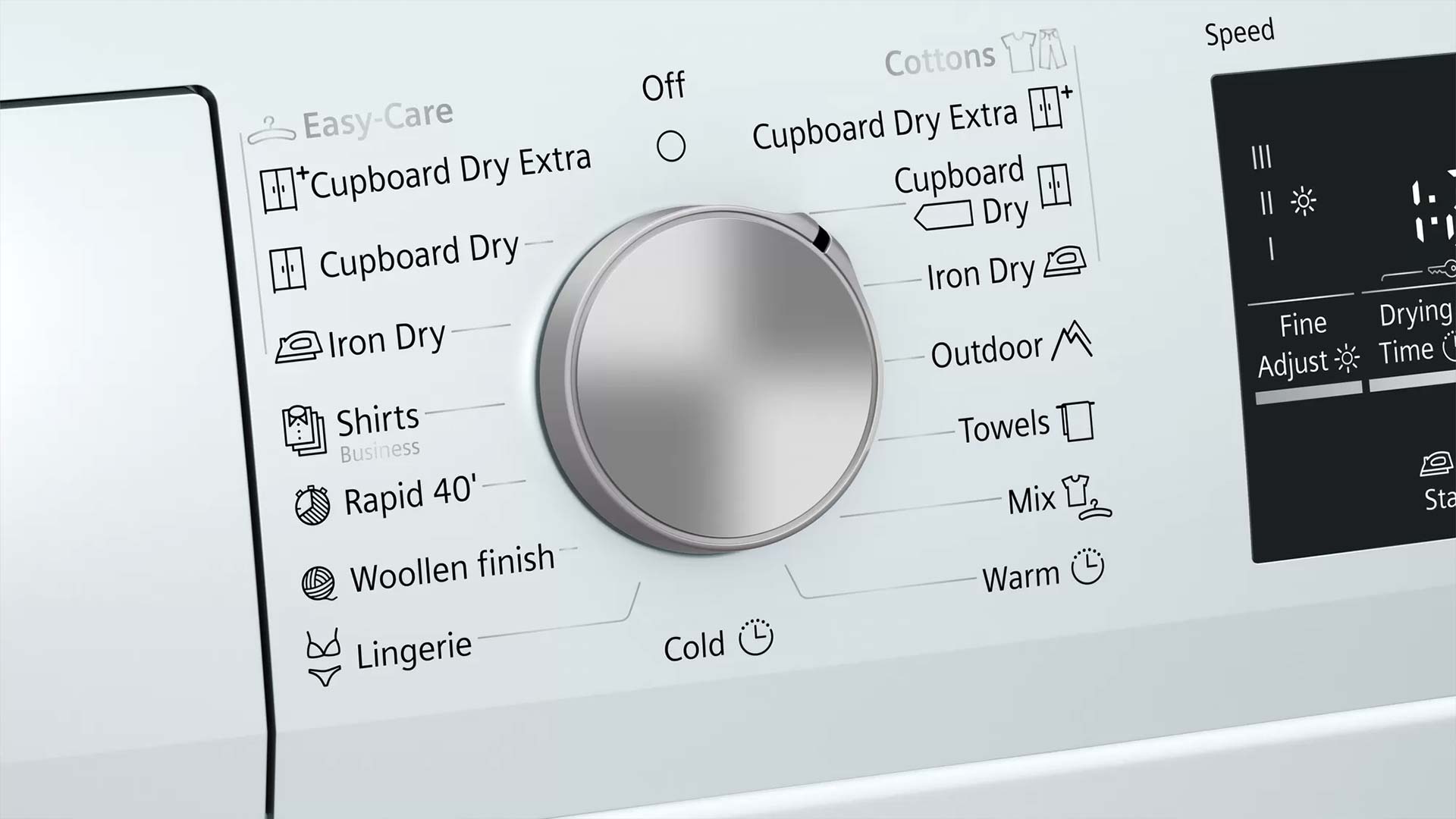 Великий світлодіодний дисплей для індикації ходу програми, обраних додаткових опцій, залишкового часу сушіння та програмування кінцевого часу сушіння на 1-24 год